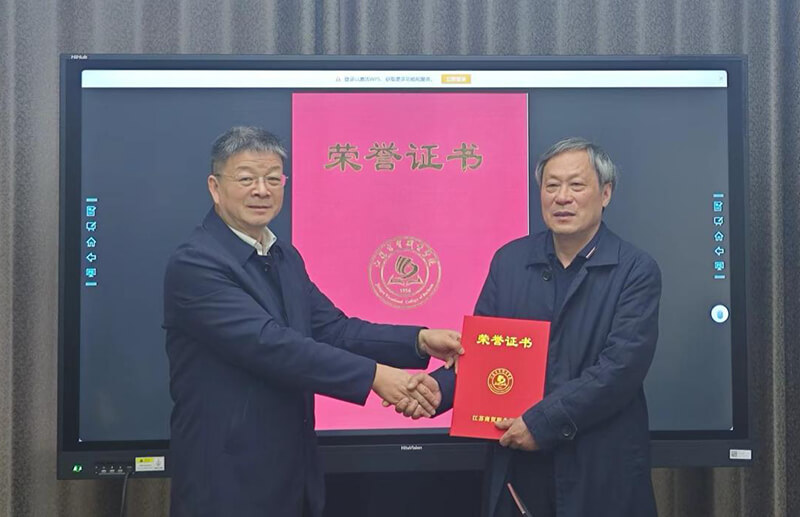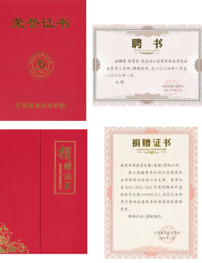 ↑冯志明书记(左)为陈家俊董事长颁发荣����� �������Ƴ������������ �������Ƴ������������ �������Ƴ������������ �������Ƴ�������誉证书和“苏商奖学金”捐赠证书